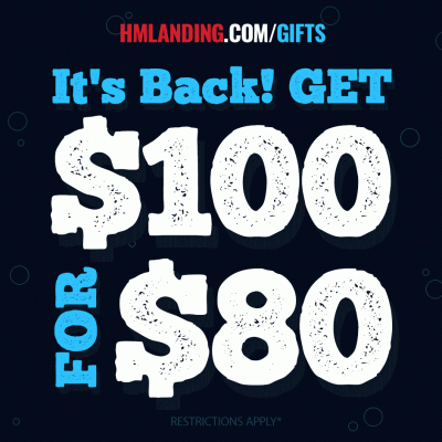 **Gift cards are in a virtual format and redeemable toward trip tickets when purchased on hmlanding.com or tackle & merchandise in the H&M Landing Store (online shop excluded).