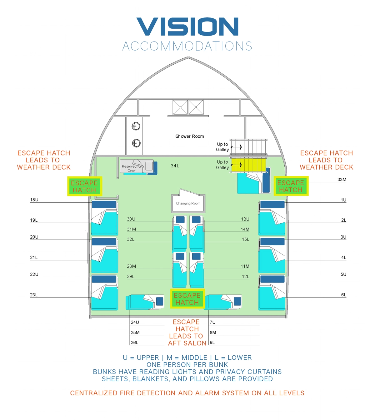 | The number in parentheses refers to maximum capacity at listed rate. The Vision can accommodate up to 32 passengers on overnight trips, and 103 passengers on non-overnight trips.